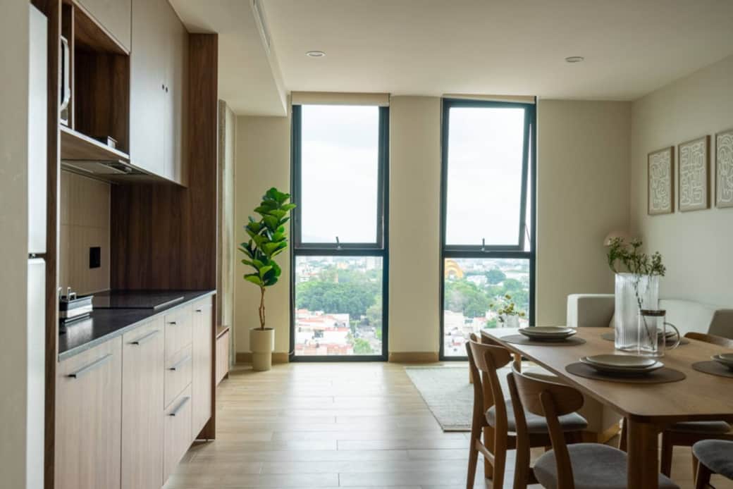 Disfruta de un moderno departamento doble, ideal para tu estancia cerca de la Expo, a solo una cuadra. La torre ofrece gimnasio, coworking y estacionamiento privado. Espacios cómodos y bien iluminados, perfectos para descansar o trabajar. Vive la comodidad de estar cerca de eventos, ferias y actividades de la ciudad, con todos los servicios a tu alcance, en un ambiente seguro y prÔctico para viajeros que buscan conveniencia y estilo.